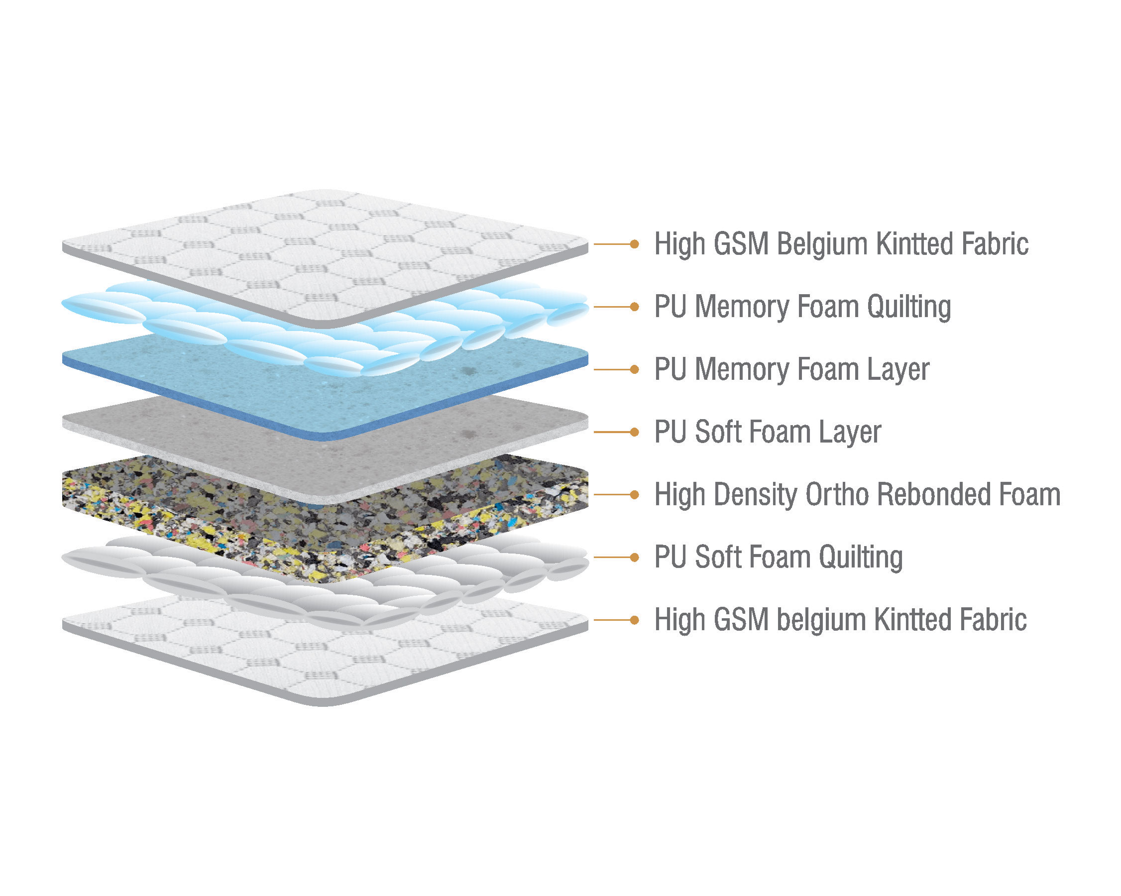 The Dreamland Mattress is your perfect escape to uninterrupted rest. It features a durable rebonded foam base for firm orthopedic support, topped with a pressure-relieving memory foam layer, and enhanced by quilted memory foam stitched into the top fabric layer. Wrapped in ultra-soft 350 GSM premium fabric, Dreamland delivers the ideal blend of deep support and cloud-like comfort. Whether your a back sleeper needing alignment or someone who enjoys a cozy, contouring surface” this mattress adapts to your body and gives your spine the rest it deserves.